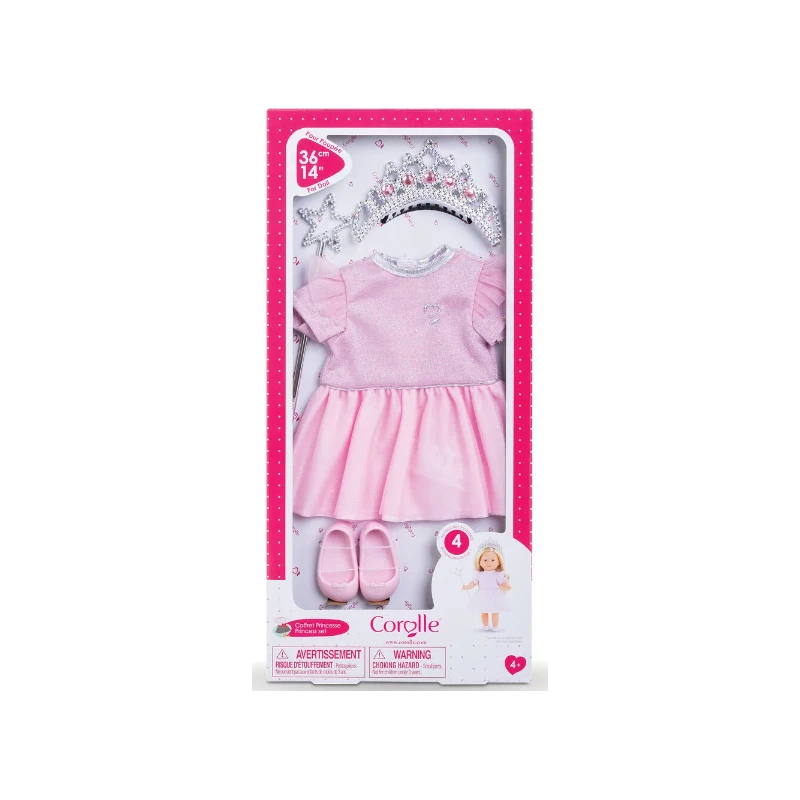 Coffret pour jouer à la princesse avec sa poupée ma Corolle. Contient 4 accessoires factices : 1 robe de princesse 1 diadième 1 baguette magique et 1 paire de ballerines. ma Corolle : Ma poupée Mes histoires ! Dès 4 ans. Avertissement De Sûreté A utiliser sous la surveillance d’un adulte.