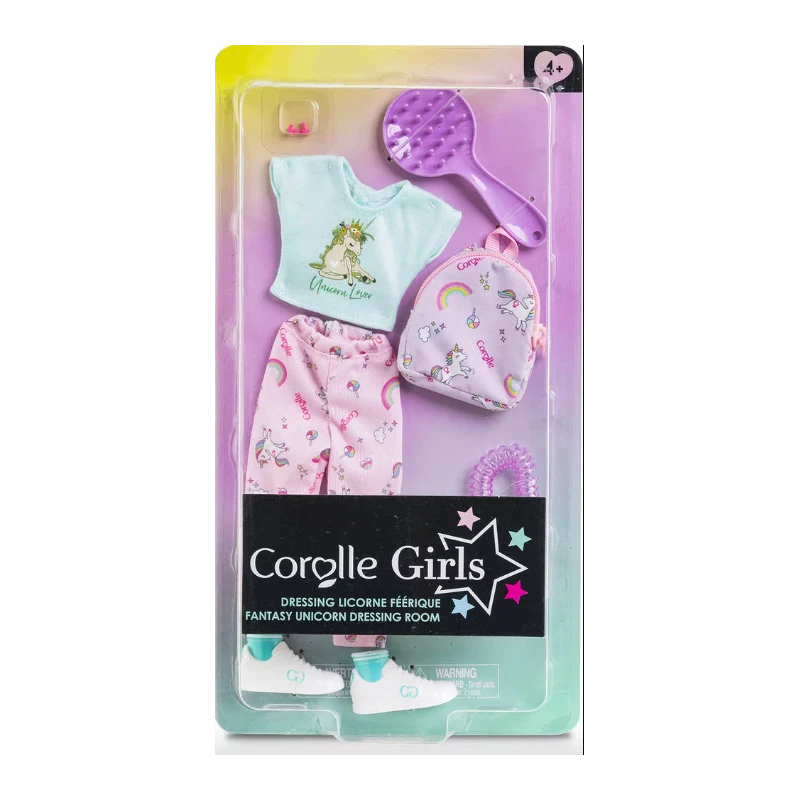 Le Dressing Licorne Féérique constitue une tenue complète (7 accessoires) ultra-tendance pour aller se promener avec ses amies et imaginer de nombreuses histoires avec les poupées Corolle Girls. Le Dressing Licorne Féérique peut être combiné avec les autres Coffrets Dressing Corolle Girls et les Coffrets Poupées Corolle Girls pour stimuler encore plus l?imagination de vos enfants dès 4 ans. 1 brosse à cheveux, 1 paire de boucles d?oreilles, 1 élastique à spirales, 1 T-Shirt, 1 legging, 1 paire de baskets amovibles et 1 sac à dos Convient aux poupées mannequins Corolle Girls (28 cm). Corolle Girls, mes meilleures amies Avertissement De Sûreté Ne convient pas à un enfant de moins de 3 ans