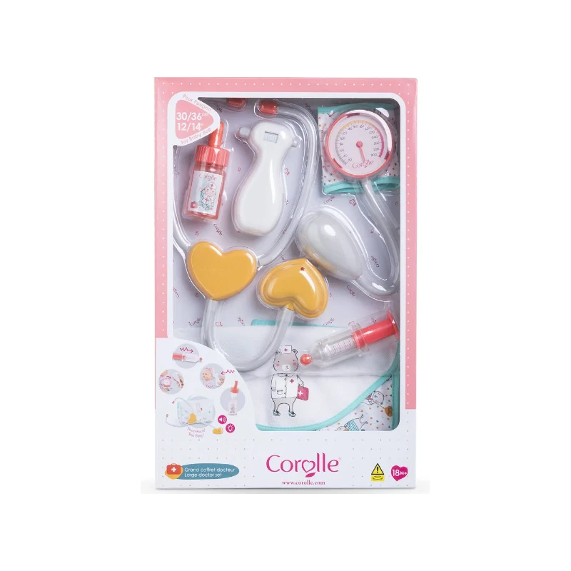 Idéal pour dédramatiser les visites chez le pédiatre ! Le Grand Coffret Docteur est fait pour ausculter et soigner son petit poupon de 30 cm. Il comprend un stéthoscope qui simule les battements du c?ur une seringue rétractable un flacon de vitamines un tensiomètre un thermomètre et une mallette pour tout ranger. Fonctionne avec 3 piles AG13 (LR44) incluses. Les petits poupons de 30 cm disposent d’une collection variée de vêtements et d’accessoires dans la gamme mon premier poupon Corolle pour pouponner pour la première fois. Dès 18 mois. Avertissement De Sûreté A utiliser sous la surveillance d’un adulte.