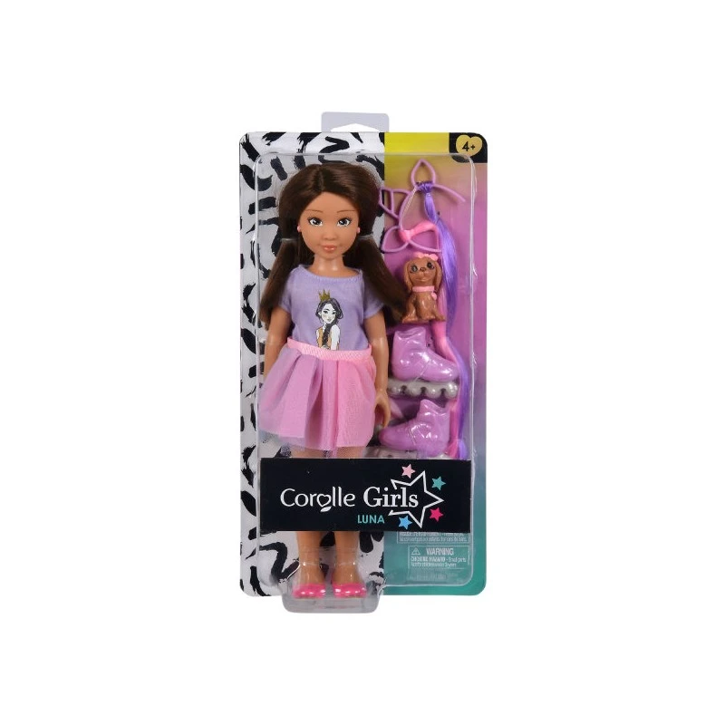 Le coffret Luna Licorne est composé de Luna, une poupée mannequin de 28 cm, et de 6 accessoires. Luna a un joli visage naturel aux traits fins qui sent bon la vanille. Ses yeux sont peints et elle possède de longs cheveux bruns, coiffés d?un serre-tête licorne avec des extensions. Elle porte une paire de boucles d?oreilles amovibles, une robe tutu et une paire de ballerines amovibles. Luna est créative et adore dessiner des paysages oniriques notamment. Elle adore aussi faire du roller et possède donc une paire de rollers amovibles. Elle a un corps réaliste de jeune adolescente, tient assise et debout toute seule. Son chien, qui l?accompagne tout le temps, se prénomme Tahiti, un bel hommage à l?ile dont elle est originaire. Les Corolle Girl