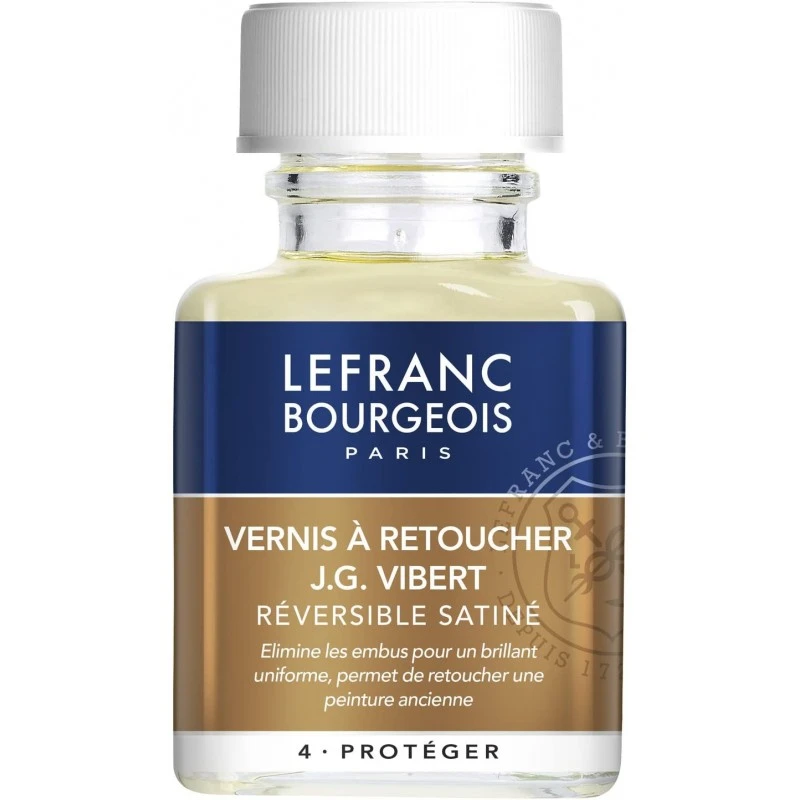Lefranc Bourgeois propose une large gamme d?additifs dans différents formats : tubes, flacons et aérosols. Pour apporter la touche finale de chaque ?uvre et lui permettre de résister au temps, Lefranc Bourgeois a mis au point des vernis aux finitions variées pour sublimer et protéger le travail du peintre. Finition satinée. Élimine les embus pour un brillant uniforme. Permet de retoucher une peinture ancienne. Vernis provisoire et isolant.