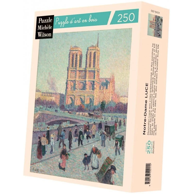 Puzzle d’art en bois de 250 pièces, découpé à la main en France respectant l’environnement. Vendu en boîte luxueuse. Maximilien Luce est un peintre néo-impressionniste qui adopte ici la technique divisionniste de Seurat. Il place Notre-Dame en pleine lumière pour montrer son coté éternel et son rayonnement sur le peuple placé dans l’ombre. On découvre la vie très active des Parisiens en 1901. Dimensions : 22 x 26 cm (environ)