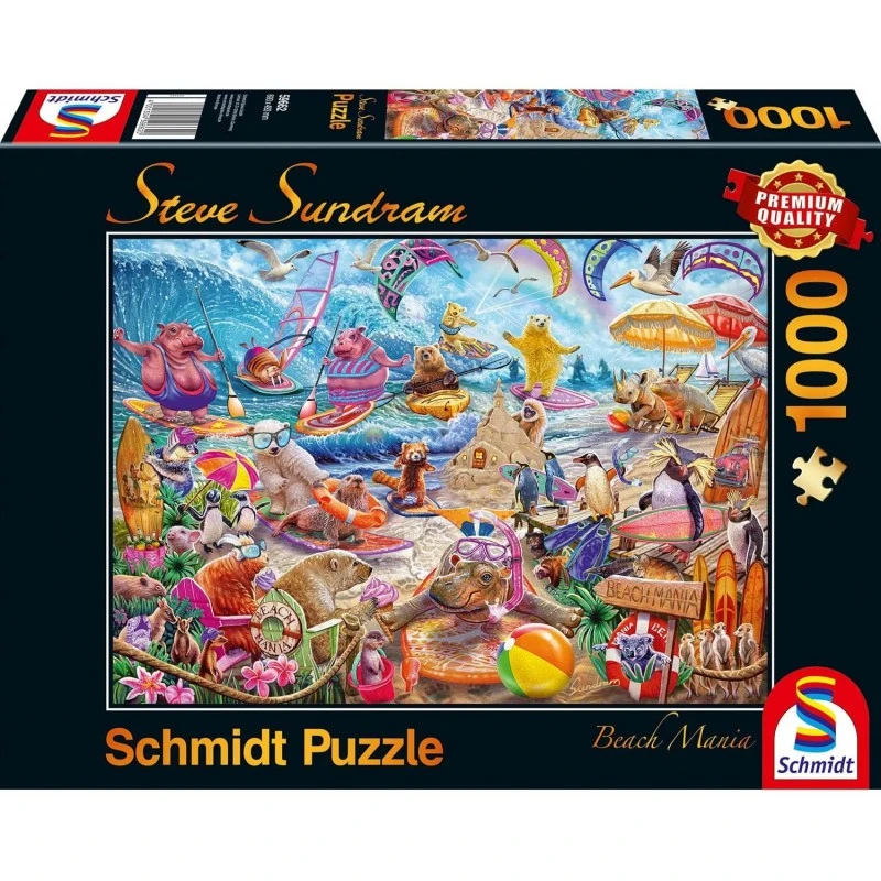 Beach Mania is a fun and colourful quality 1000-piece jigsaw puzzle from the Schmidt CollectionThis 1000-piece puzzle is an illustration by Steve Sundram, a talented artist whose endeavour through his paintings is to promote the beauty and preciousness of all living creatures. His perspective is that once you are touched by the magnificence and wonder of this Earth, it is then only natural to care and protect all of her nature as well.Completed size: 69 x 49cmRenowned for the excellent quality of their jigsaws, Schmidt Spiele have a range of engaging images fresh and up-to-date. They are produced to a very high standard using the best materials available with individually shaped and close-fitting pieces for a satisfying puzzle experience. T