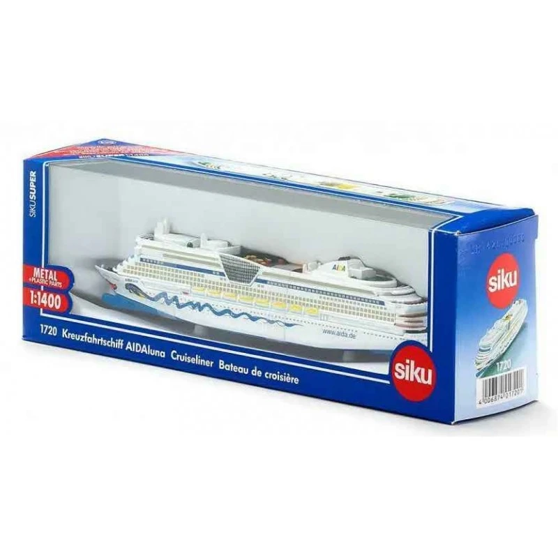 Maquette détaillée du bateau de croisière AIDAluna à échelle 1:1400 pour jouer ou à collectionner – Jouet robuste en métal pour plus de stabilité, Bonnes propriétés de roulement grâce à ses pneus en caoutchouc – Idéal comme cadeau pour les enfantss mais également en décoration pour les adultes – Facile à transporter pour des moments de jeu durables grâce aux innombrables possibilités de combinaisons avec autres véhicules SIKU de la même collection – Contenu: 1x SIKU 1720 ? Bateau de croisière AIDAluna, Echelle: 1:1400, Matériaux: Métal/Plastique, Dimensions: 18,1 x 2,7 x 4 cm, Poids: 0,12 kg, Couleur: Bleu/Blanc, Série: SIKU SUPER Avertissement De Sûreté Ne convient pas aux enfants de moins de 3 ans, petits éléments détachables susceptibles